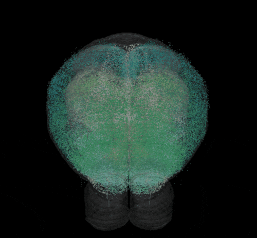 3D rendering for c-Fos positive nuclei across a whole brain using Wholebrain pipeline.
